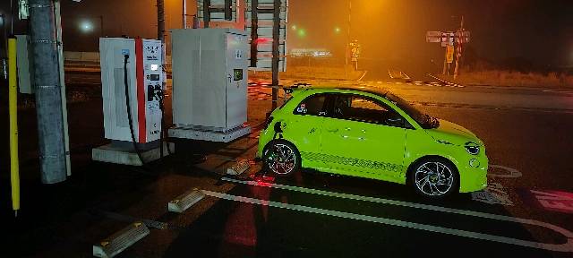 アバルト500e、使えました。 駐車場入ってすぐ左手で、インター入り口正面です。