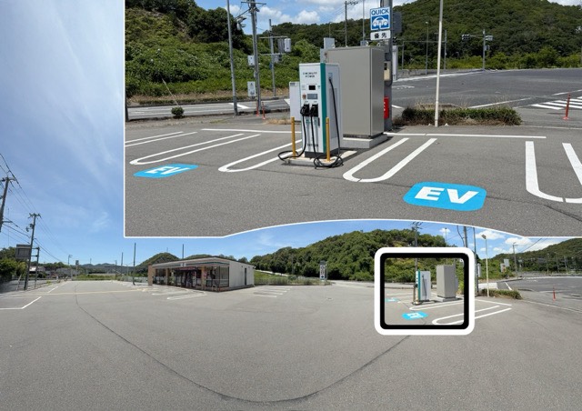 • 道路から見て左側の入り口近くにあります。コンビニにあるというのがとても良いです。  近くにトヨタの150kW機ができましたが、充電カードユーザーにはこちらの方が便利で使いやすいと思います。  何より「繋ぐ」「かざす」だけで充電が始まるのが楽で良いです。