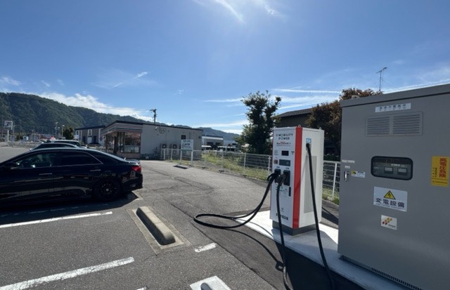 ABB製150kW2口器です。店舗の西側に設置されてます。広い駐車場なので転回スペースはあります。