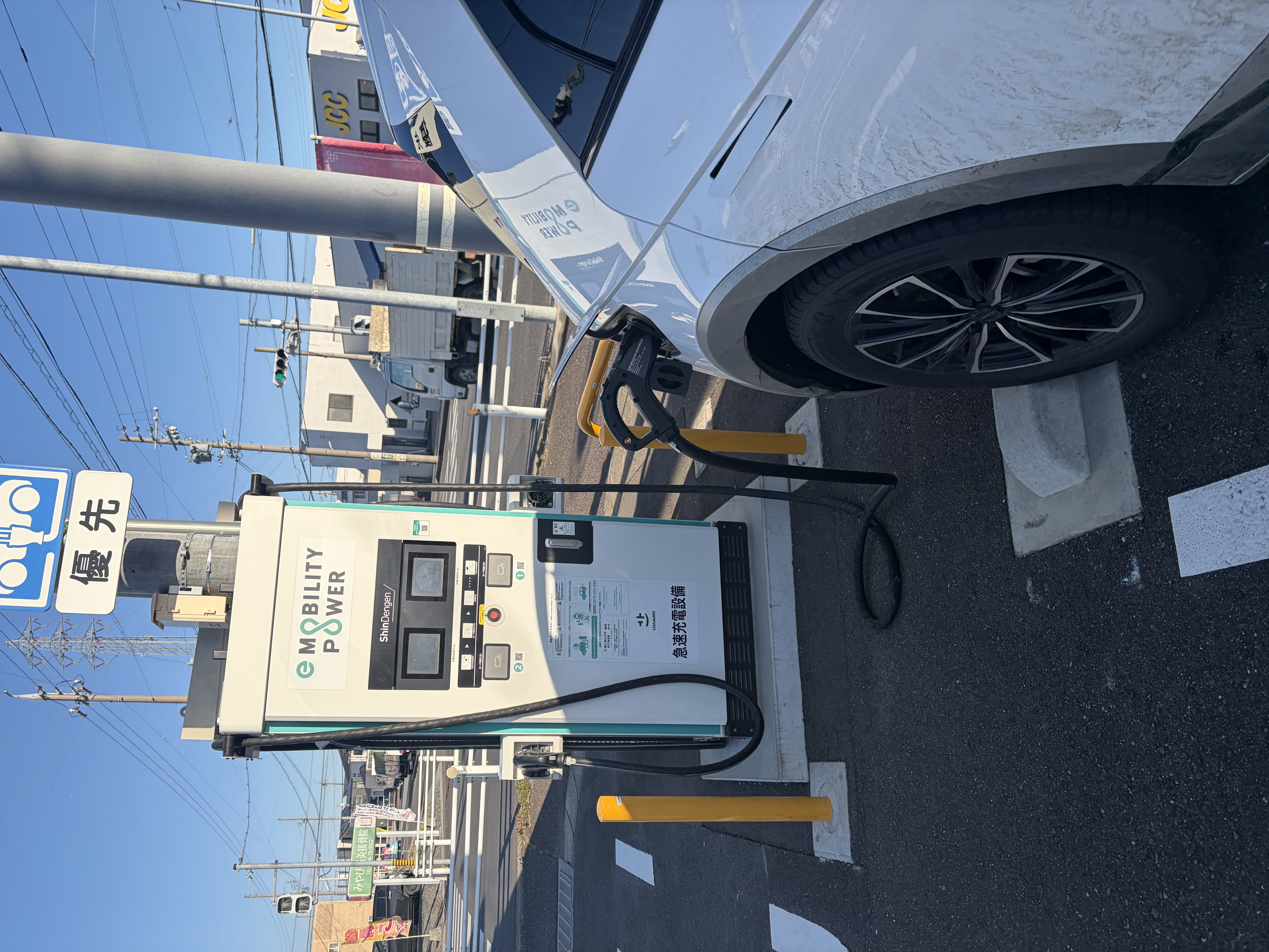 ファミリーマートの駐車場に急速充電器が1台分あります。 E-MOBILITYpowerなので、出力は50kwあるので、安心です。