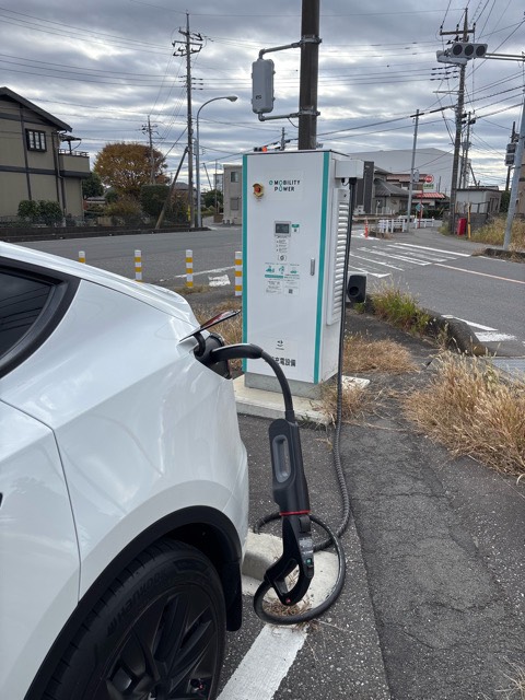 交差点付近にnichicon製50kW機が1台設置されています。駐車枠が横付けタイプなので、充電ポートの位置に関わらないのは良いですね。