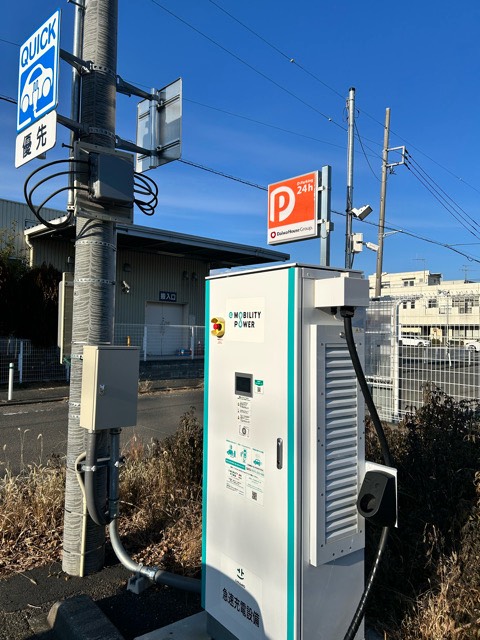 DAIHEN Corporation製50kW器です。店舗から少し離れた東側に駐車枠に設置されてます。