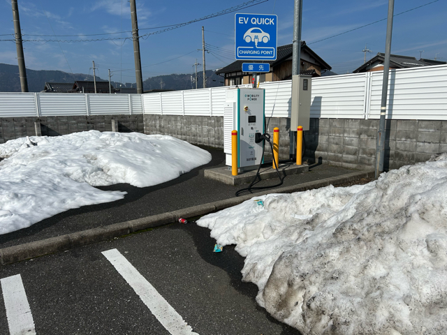 除雪の雪が積み上がっています。何とか近くへ寄せれば車によっては充電できます。