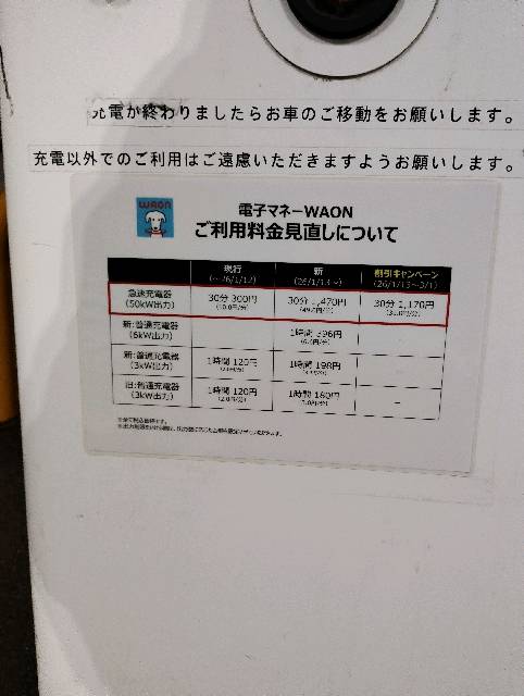 • トイザラスの建物の横に、高速充電があります。 普通充電と横並びです。写真側は、高速充電器です。 nanacoですが、新型の高速充電が30分で300円。安い!