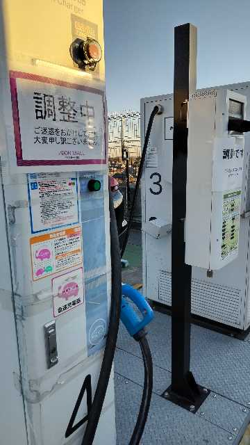 NEC製50kw急速充電器とNEC製3kw普通充電器が設置されていますが、急速充電器は故障中のため利用できません。(11/8時点) 普通充電器は、e-Mobility Power系カードまた、WAONから利用できます。WAONの場合は、120円/時間です。急速充電器は、既に修理部品が生産されておらず、復旧の目処が立っていないようです。新しい充電器に更新されるといいですね!