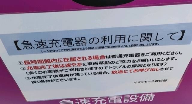 本日のこと…充電は終了しているようですが、充電スペースに停めたままの車両がありました。 以前の10基から6基に減少しているので休日等混雑する時は特に充電終了したら車両の移動をお願いします。 ナンバーから推察するとテナントさんの車かもしれませんが…。