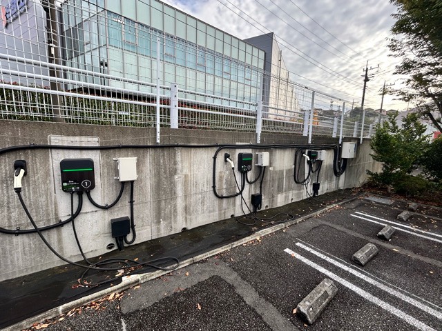 ↓の写真の壁の裏にもう1基あり、全部で3基あります。3kW or 6kW 。 充電器が横の壁付けのため、リーフは後進駐車でも届きました。充電ポートが運転席から見て右後方の車両は、ケーブルが届くのか若干怪しいですが、2番ポートに後進駐車、または3番ポート(壁裏)に前進駐車すれば確実に届くと思います。