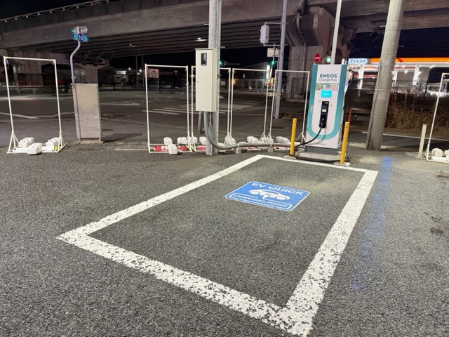 側道の道から見て右側、セブンイレブンの看板の近くにあります。 この辺りは急速は数あれど24時間営業は少なかったので増えたのは嬉しいですね。使用中でも至近距離に24時間のトヨタの急速もあります(写真でいうとレクサスの建物の左側から入るとあります。 追記: 45kW出ていました。 追記2: 「充電終えた後のケーブルは元の位置に戻してください」どの張り紙がありました。気をつけましょう。 文書改訂