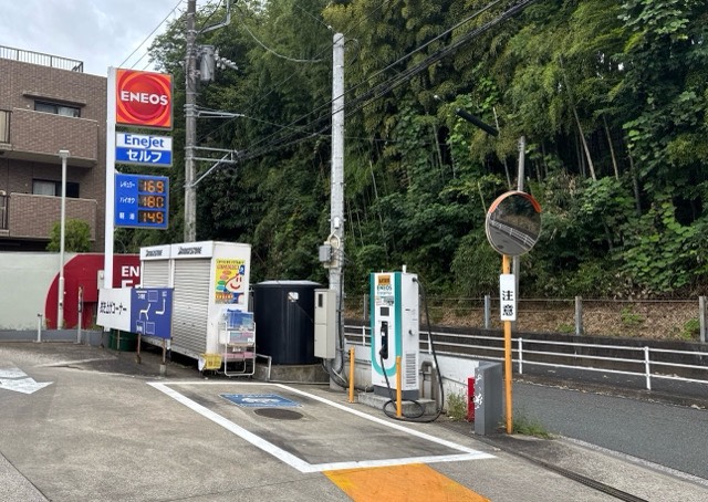 使えました。 県道に沿ったスタンドの敷地の外に充電器があります。 充電口が左のため、折返して定位置へ。 横は道路、切り返して白線内へ。