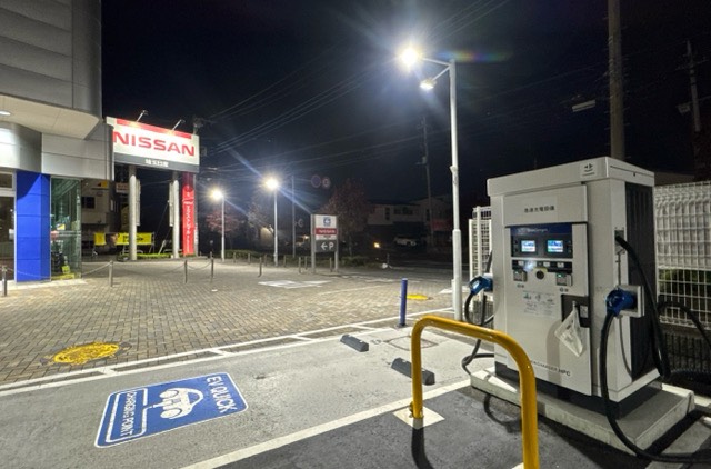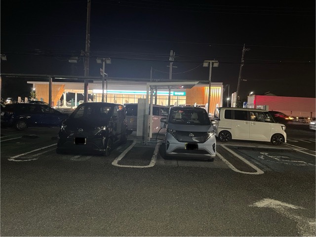• 夜で街灯が少ないのでNissanの明かりが頼りですが快適にチャージしました。 前の道が渋滞するのでかえって好都合ですよ。 近くにコンビニあってグーです。