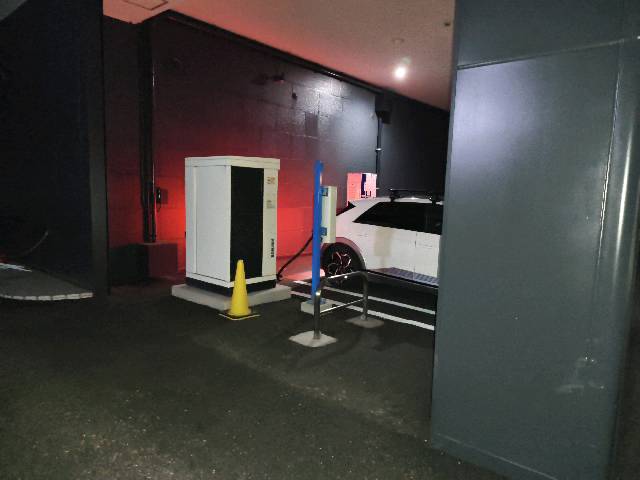 • 充電スペースが傾斜してるのでドアの開け閉め注意ですが、問題なく充電できました。ショールーム側ではなくサービス工場裏手(北西側)に充電器あります