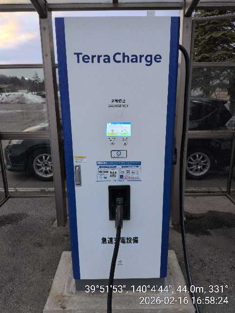 DMMの急速充電器。まだ設置から1年程度しか経っていないはずなのに、駐車区画の「CHARGE POINT」のサインパネルが割れていました。おそらく除雪車が引っ掛けたのだろうと思います。こういう場所は塗装でなければダメなんですけどね。