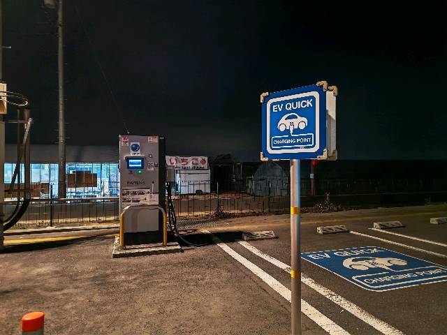 • 道の駅駐車場南東側にJFE製50kw急速充電器が設置されていました。e-Mobility Power系カードやエコQ電認証から利用可能です。充電器がある場所の案内はあるものの、駐車場が広いので充電器を見つけるのが少し大変かもしれません。