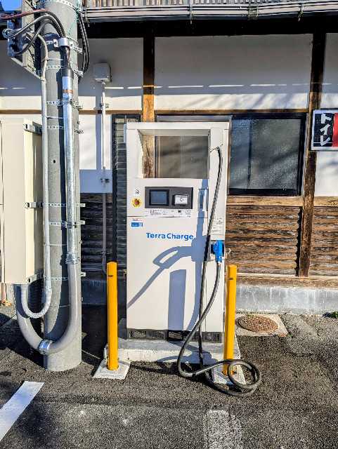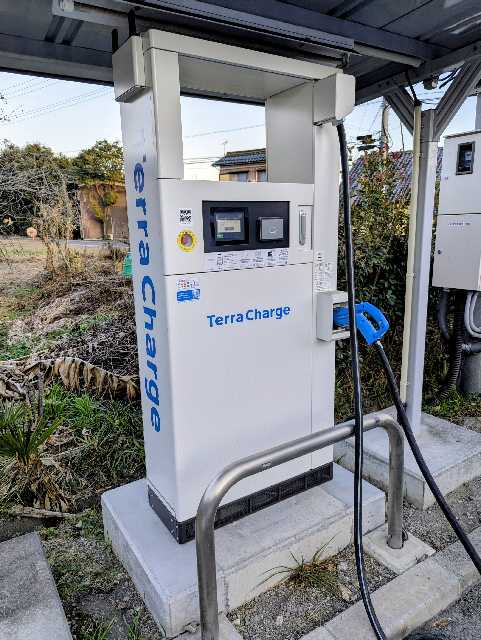 TerraCharge認証新電元工業(株)50kW充電器です。TerraChargeのアプリ登録で充電します。道の駅駐車場入って(裏から)右手に設置されてます。