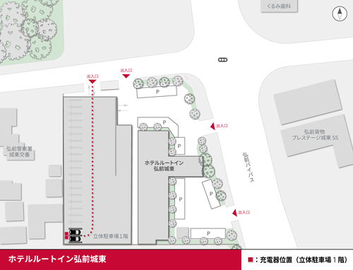 設置場所:ホテル裏、建物中央の壁沿いの車室にEV充電器があります。