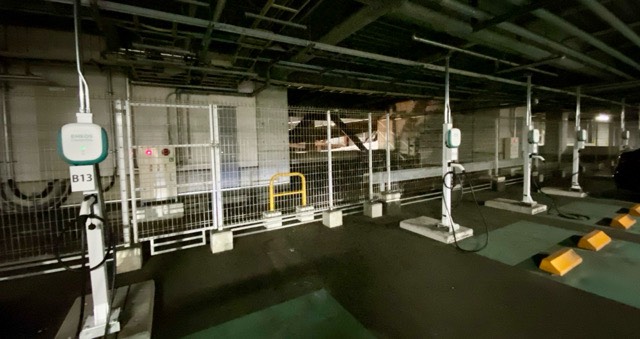 立体駐車場を最上階まであがったところにあります。充電スペースには屋根がないので雨天や夏場は困りますね。