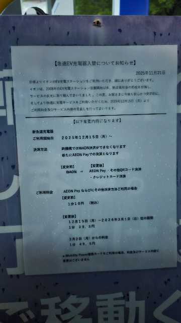 [急速充電器] 2015/09/01よりNCS(現eMP)スポットとして運用。 [普通充電器] 2015/09/01よりNCS(現eMP)スポットとして運用。 【ビジター料金やeMP未加盟充電器の情報等】 駐車有料(2020/02/21より入庫から3時間まで駐車無料)。 ◆WAON認証の場合 [急速充電器] WAON(充電1回30分300円(税込))。 [普通充電器] 2020/03/02より充電有料。 WAON(充電1時間120円(税込))。 eMP提携充電カードで支払いの場合はご利用の料金プランに準じた金額になります。