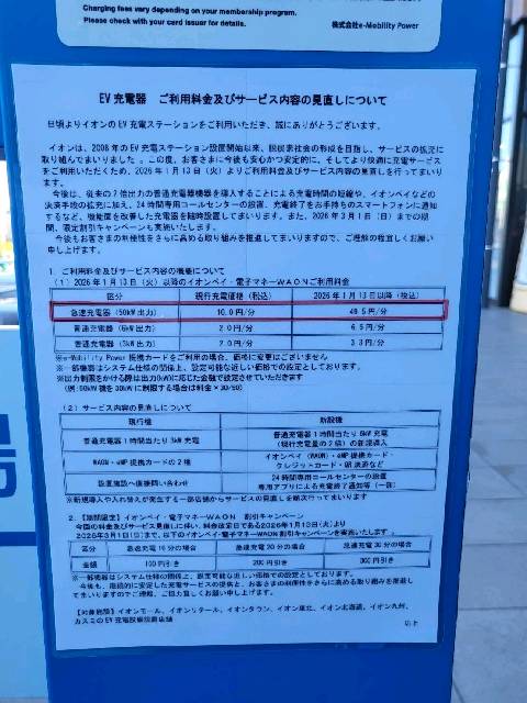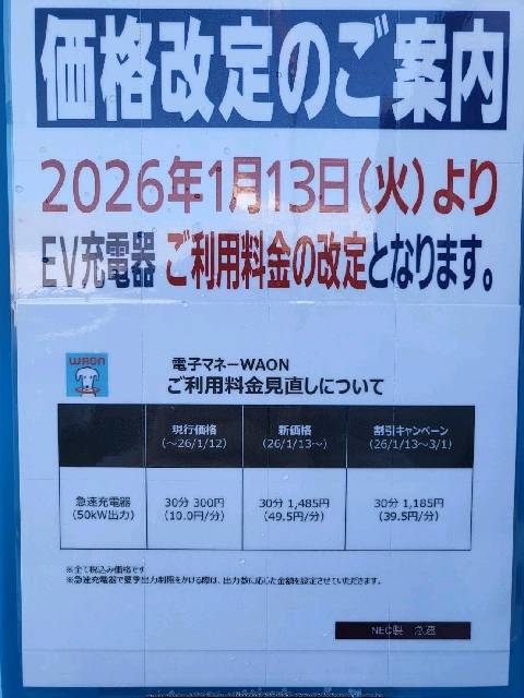 [急速充電器] 2022/04/06よりeMPスポットとして運用。 【ビジター料金やeMP未加盟充電器の情報等】 ◆WAON認証の場合 [急速充電器] WAON(充電1回30分300円(税込))。
