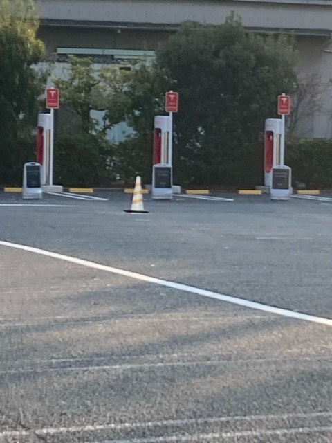 テスラのスーパーチャージャーです。 マイプラゴやイオン充電器の近くにあります。 コーン設置されていました