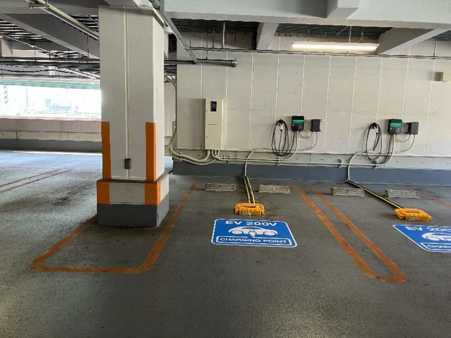 設置場所:立体駐車場2階(屋上)に上がってすぐ右折し、左側一番奥の車室にEV充電器があります。 どなたでもご利用いただけます。 最大出力6kW