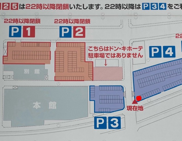 この地図で、P4左下の赤丸をつけたところに一台あります。駐車料金は無料です。