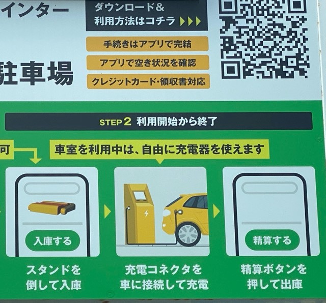 EVの専用区画ではありませんがコード長いので左右含めて5台ぐらいの位置で使えそうです。とめやすくてよかったです。