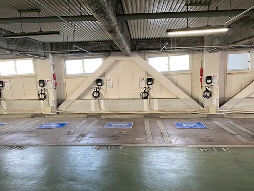 充電設備は3台分ございますが、車室は2台分となっております。譲り合ってお使いください。