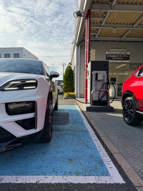 【車種】: マカン 【充電速度】: 普通 【充電した時間】: 約15分 【ひとこと】: 出入りの多いところにあります。 新車を積んだ積車が来て邪魔そうだったので早々に退散しました。