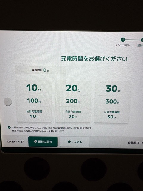 新しいエネオスチャージプラス機もWAON認証では30分300円でした。しかも、10分単位で選べるようになったのが良いです。