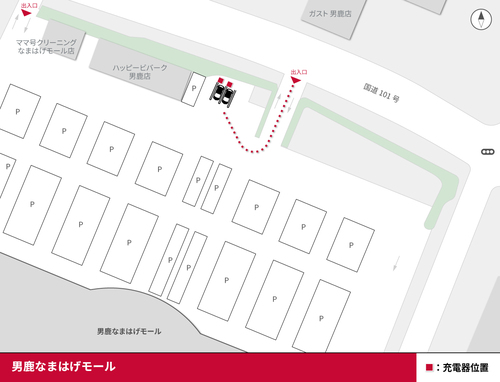 祝祭日9:00~22:00設置場所:国道101号線沿いの入り口より敷地内へ入り、右折し道路沿いの駐車スペースにEV充電器があります。 どなたでもご利用いただけます。 最大出力6kW