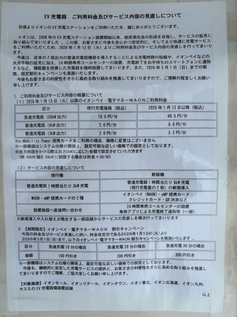 [急速充電器] 2021/09/01よりeMPスポットとして運用。 [普通充電器] 2021/09/01よりeMPスポットとして運用。 【ビジター料金やeMP未加盟充電器の情報等】 ◆WAON認証の場合 [急速充電器] WAON(充電1回30分300円(税込))。 [普通充電器] 2020/03/03より充電有料。 WAON(充電1時間120円、2時間240円、3時間360円(税込))。 eMP提携充電カードで支払いの場合はご利用の料金プランに準じた金額になります。