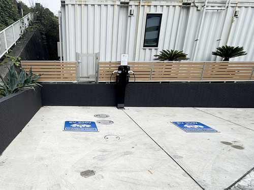 不定休あり(施設営業日に準ずる。詳しくは施設へご確認ください。) まてばしい通り沿いの入り口より敷地内へ入り、直進し突き当りの車室(駐車場1階)と立体駐車場 6階にEV充電器があります。 どなたでもご利用いただけます。 最大出力6kW 施設の電気容量により一時的に充電器の出力が変動する場合があります。