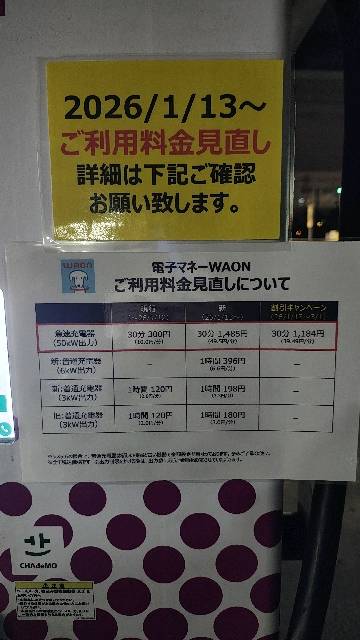 時間無制限6kW15分90円で充電できます。1時間前からアプリで充電場所の予約が出来るので助かってます。