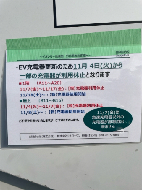 31日夕方に来たのですが、前の方と同じで2台とも調整中でした。実はこの前にイオンタウン成田富里にも寄ったのですが、やはり調整中で充電できませんでした。WAONで充電したかったのに駄目でした。充電器が古めなので、更新するのであれば嬉しいのですが、取り外しとか、値上げとかは出来たらやめて欲しいですね!!!