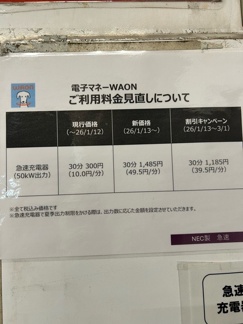 ★オフィシャルサイトより確認★ 2026/01/13(火)~2026/03/31(日)の間、イオンペイ・電子マネーWAON支払いの割引キャンペーン実施中 急速充電 10 分の場合100 円引き、急速充電 20 分の場合200 円引き、急速充電 30 分の場合300円引き