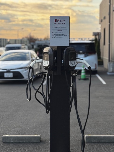 設置場所:施設建物の道路挟んで向かい側にある駐車場、道路沿いの駐車スペースにEV充電器があります。(建物側の入り口入ってすぐ右側の駐車スペース)