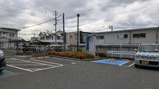 お店の前の右端、駐車場の奥の隅に充電器があります。道路から見ると正面になるのですぐ分かります。入口に近くて便利。