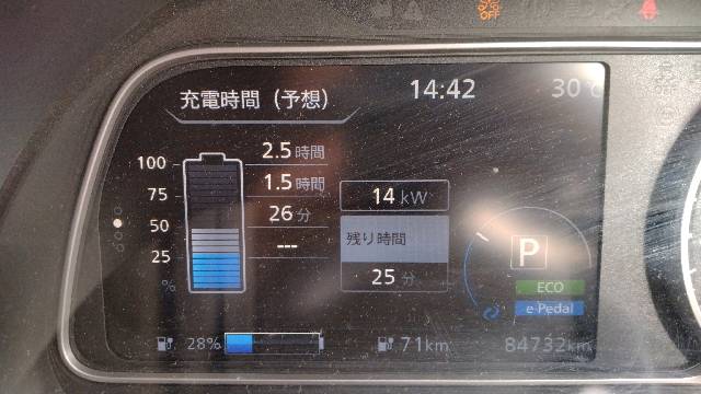 急速充電器の充電出力が14kWh(笑) 充電開始から上がらないまま30分間充電終了しました。 高浜の道の駅の急速充電器に移動されるのをお勧めします。