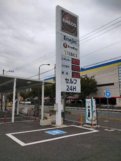 - EV用CHAdeMO充電設備は、ガソリンスタンドと洗車スペースの間に有るサインポール脇に設置されています。 道路を挟んだ斜め向かいにはミニストップとモスバーガーが有るので、ちょっとした買い物やテイクアウトなど充電時間の合間を活用できると思います。