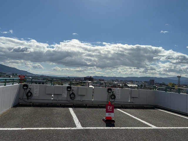 設置場所:立体駐車場1階の出口手前、左側の車室にEV充電器があります。 どなたでもご利用いただけます。 最大出力6kW