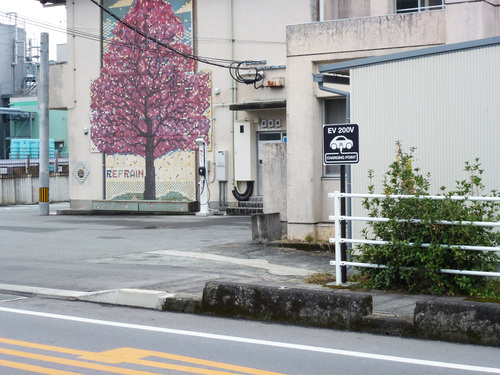 筒井時正玩具花火製造所(赤い建物)の直ぐ傍に駐車場があり、奥側にEV充電器があります。 最大出力6kW