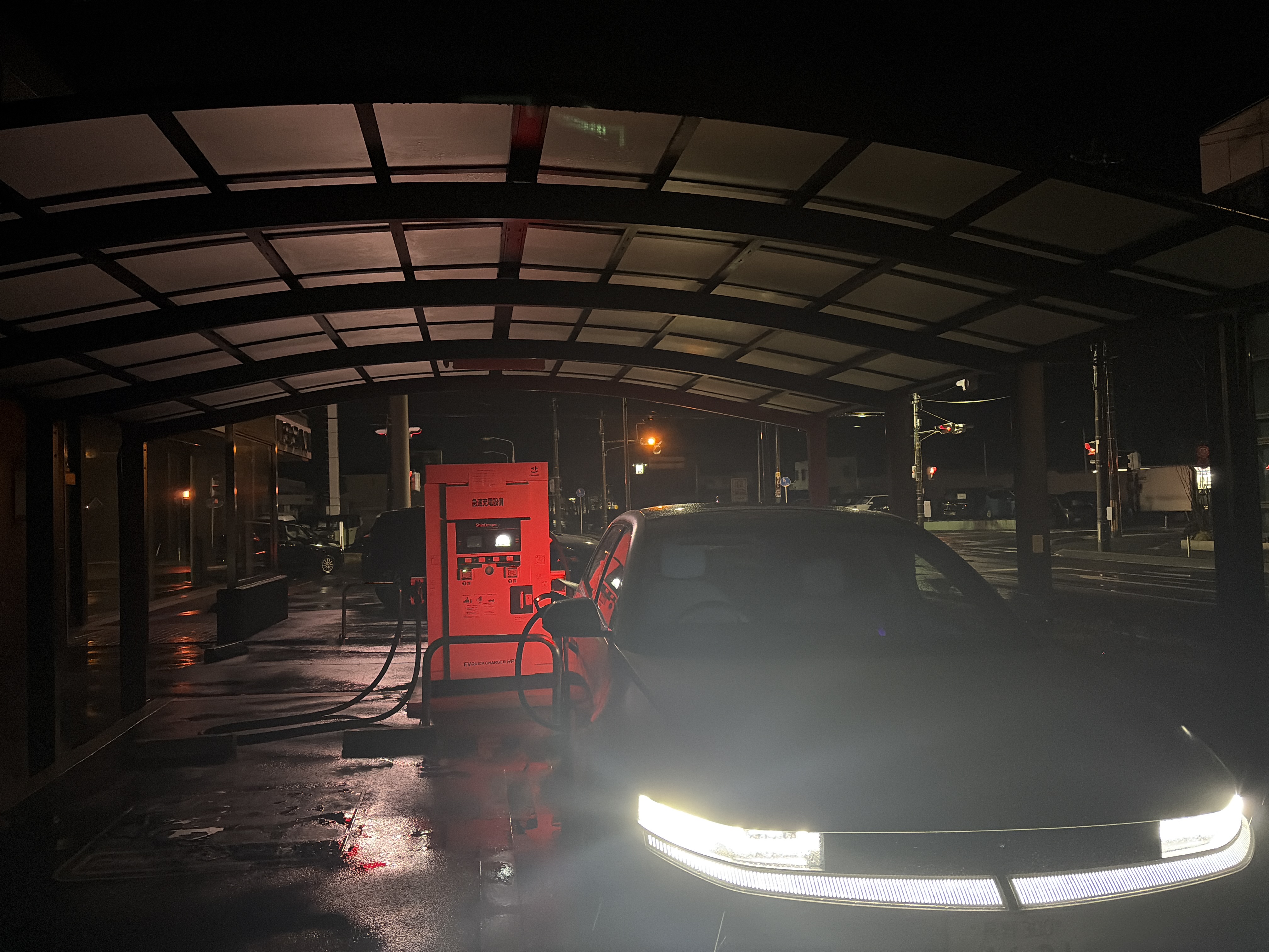 充電器の設置場所は、少し入りにくいところです。 ホイールベースの長い車両の方は気をつけてください。 ShinDengenの90kwh機は、二口のうち一口で充電している車の受電が45kwhを下回る場合、もう一口の車の受電能力が45kwh以上あれば、うまく電力を割り振ってくるんですね。 すでに充電していたリーフ40kwhの充電状態が93%、9.3kwでの充電だったので、175アンペア出ました(^_-)