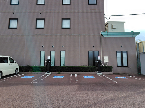 ご利用は宿泊者優先とさせていただきます。宿泊のお客様はホテルの公式サイトで詳細をご確認ください。 設置場所:国道49号線より敷地内へ入り、エントランス右側の車室にEV充電器があります。 充電器には鍵がかけられていますので、ご利用を希望される際にはフロントまでお申し付けください。 最大出力6kW