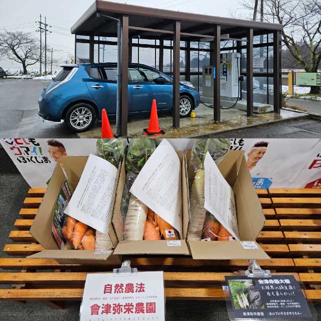 50kw機、屋根まで付いていて無料です。 おかげさまで大峠道路を万全の状態で通過できました。 EV普及とモラル低下で無料は壊滅的に減っている気がしますが、ここはとても良心的な道の駅だと思います。快くお野菜も購入させていただきました。
