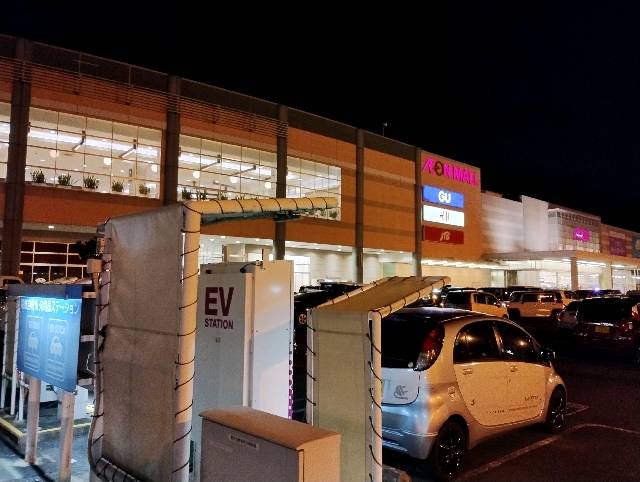 EV用CHAdeMO充電設備は、敷地東西ではほぼ真ん中、ガソリンスタンドの近くと書いた方が解りやすい人もいらっしゃると思います。 11/23夜に訪れた時は、リーフが離れるタイミングで待ちなしで充電開始。 アイ・ミーブXで充電を行ったところ、設備最大の125Aで充電が始まりました。 しばらくしてeKクロスEVにお乗りのご夫婦がやってきたので「兵庫まで帰るので、26分充電させてください」と伝えて、それぞれ車から離れてイオンモール内へ。 充電終了と共に車を入れ替えてeKクロスEVの充電開始しました。 逆の立場で考えて「先客はいつ充電終わるのかな?」とアテなく待つよりも良いかな?と思いお声がけしました。 先方も「こういう情報が有れば待つ方も気がラク」と言ってもらえたので伝えて良かったです。