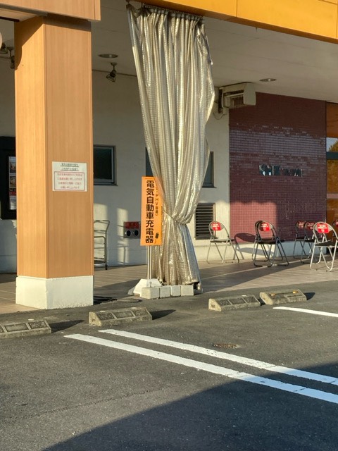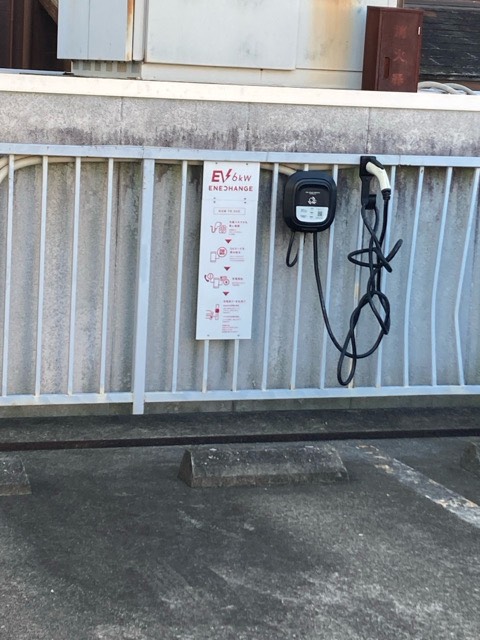 駐車場ないにあります。 従業員さんに鍵を開けてもらうと充電できます。