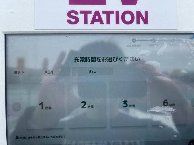 「遠い」という口コミに覚悟して行ってみれば、普通に歩いてたったの1分30秒でした。 多少は離れているのでしょうが、入口に近いとガソリン車のヤカラに占拠されがちになるので、この位置が正解。よく考えて設置されています。 ところで普通充電、3時間までとアプリ上には書いてありますが、6時間を選べたようで、これならゆっくり温泉入れます。