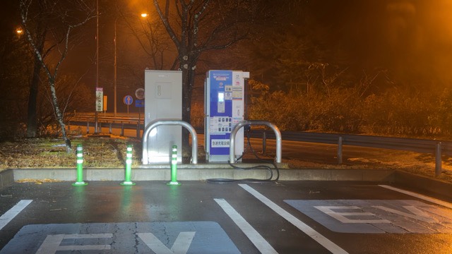 小さなパーキングエリアなので進入路からガードレールに沿って走ると充電器を通り過ぎます。画像のように充分減速して右折しないと逆走もしくは駐車区画を突っ切る必要が出てきますので要注意。 GoogleMapの俯瞰画像を参照してください。 ただ位置的にはフードコートの正面なので特等席です。 充電枠と待機枠があり、東光高岳製50kW機です。 開始時間:2024年11月24日 15:17 終了時間:2024年11月24日 15:48 充電時間:30 分 利用電力量:17.6 kWh ZESP3にて利用