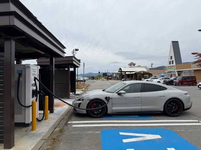 充電器が、増口されています。 150kwの2台同時充電器が1基 90kwの2台同時充電器が1基 4台同時充電できますが、 150kwの充電器で2台同時充電した場合 90kwとなります。 150kwの充電器のケーブルは、太く短いので、接続部が、車両のサイドにある自動車は、2台同時充電時は、ケーブルが届かないことがあります。