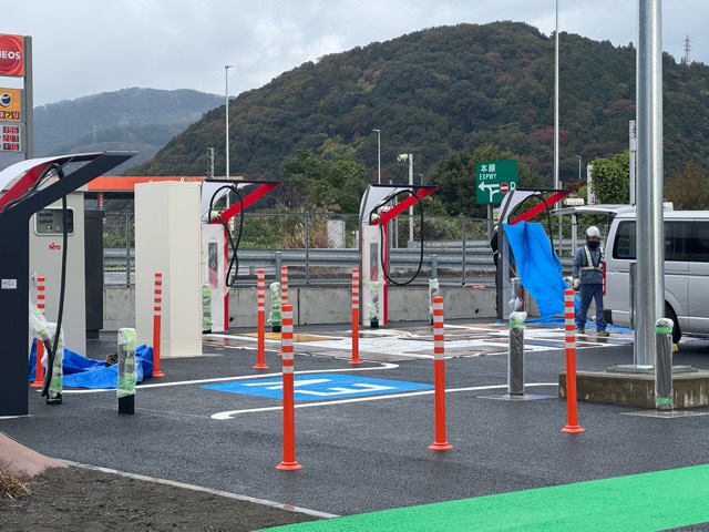 従来の充電器が使えましたが、40kWが一部故障で30kWに出力制限されてました。赤いマルチは工事期間が26年1月末までになってました。